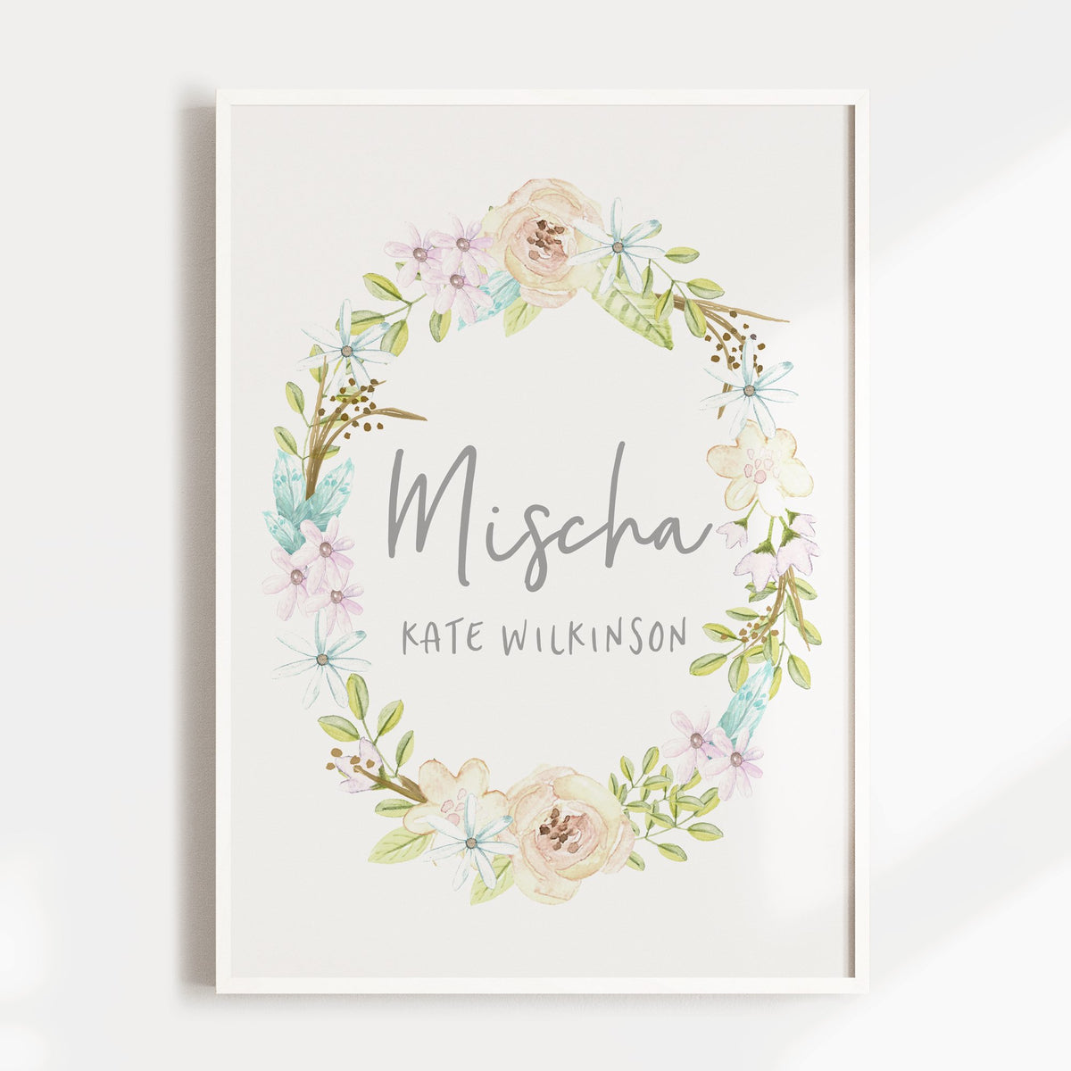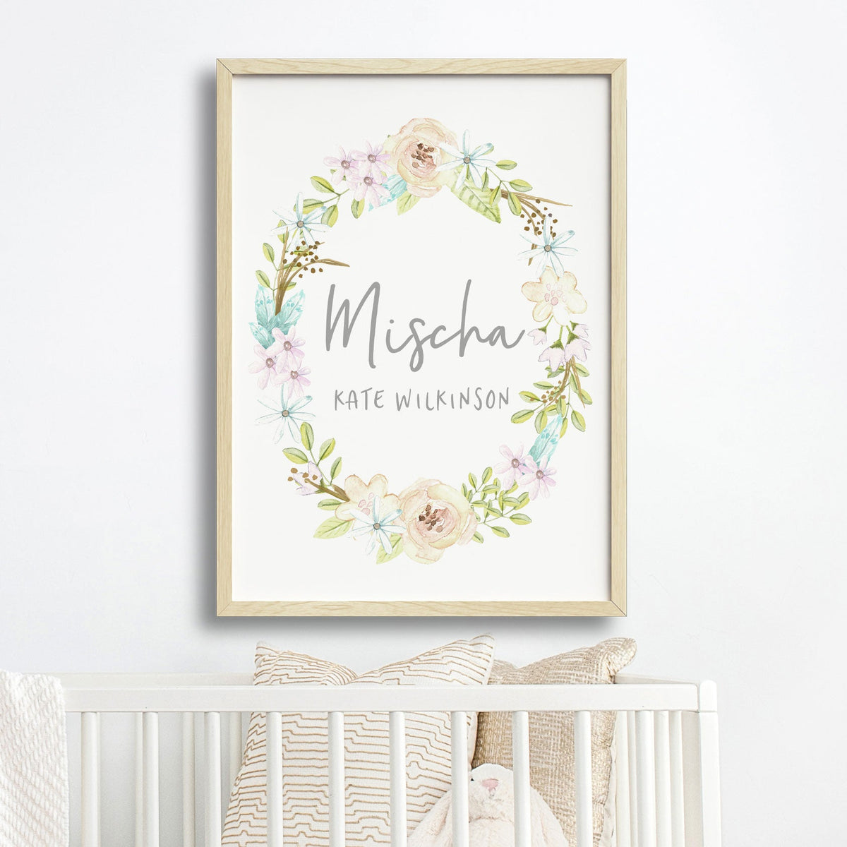 This beautiful Floral Woodland Name Print adds a personal touch to any nursery. Perfect for girls, it features a dainty floral wreath with the child's name in the center. The perfect personalized addition to any nursery.