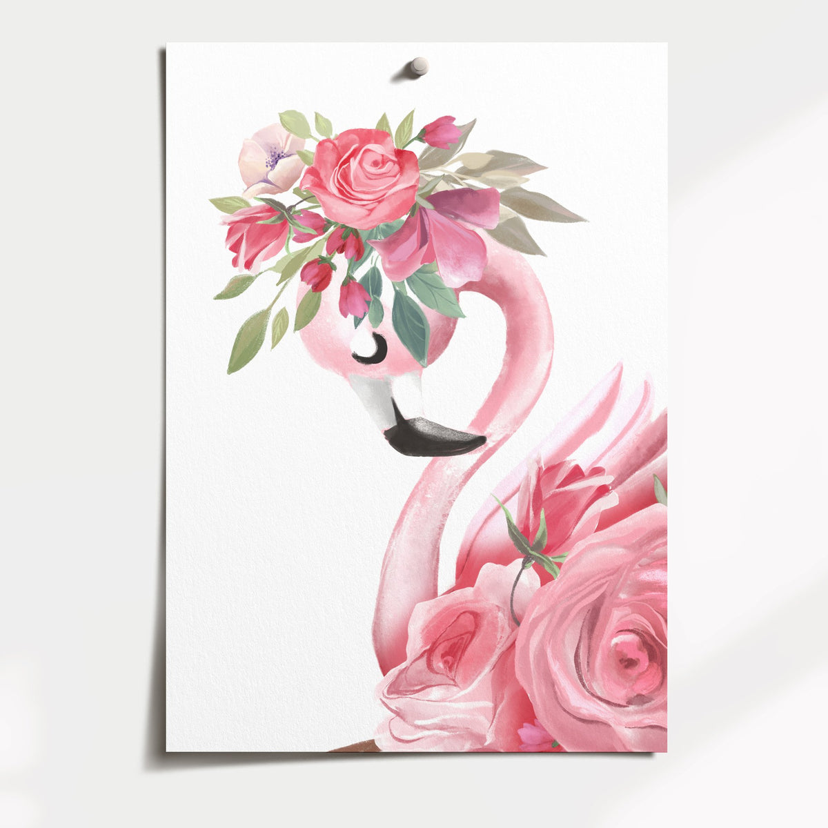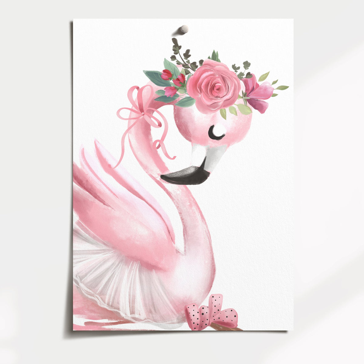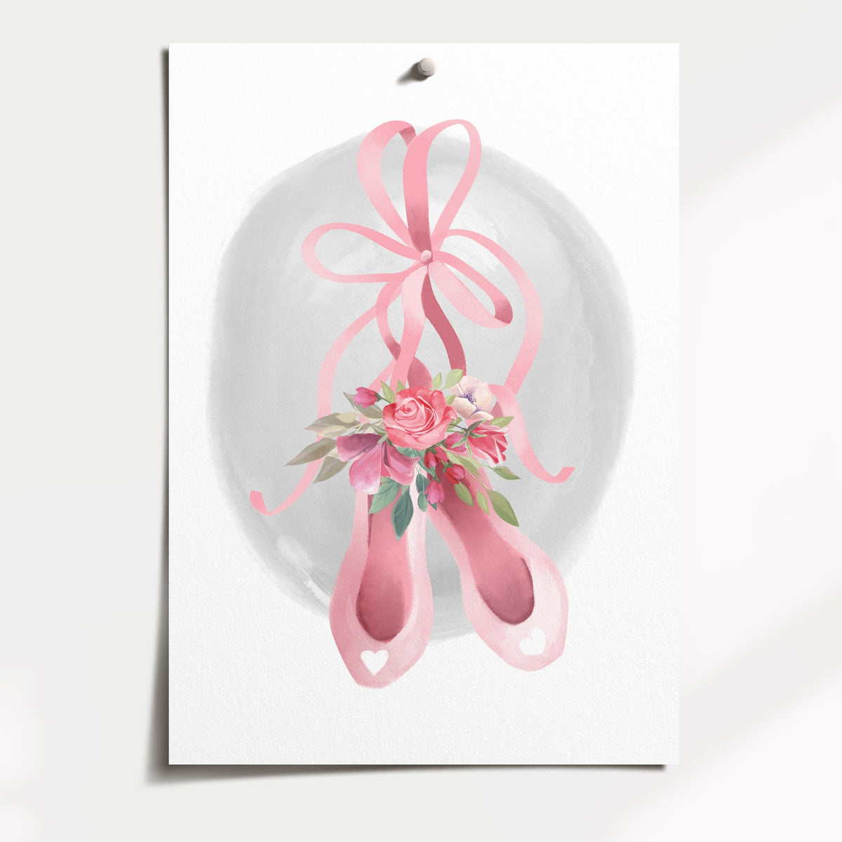 A set of three watercolour, ballet inspired nursery wall art prints, featuring two floral flamingos in tutu's and a pointe shoes print. A perfect new baby gift or add the finishing touches your own little girls bedroom or playroom decor.
