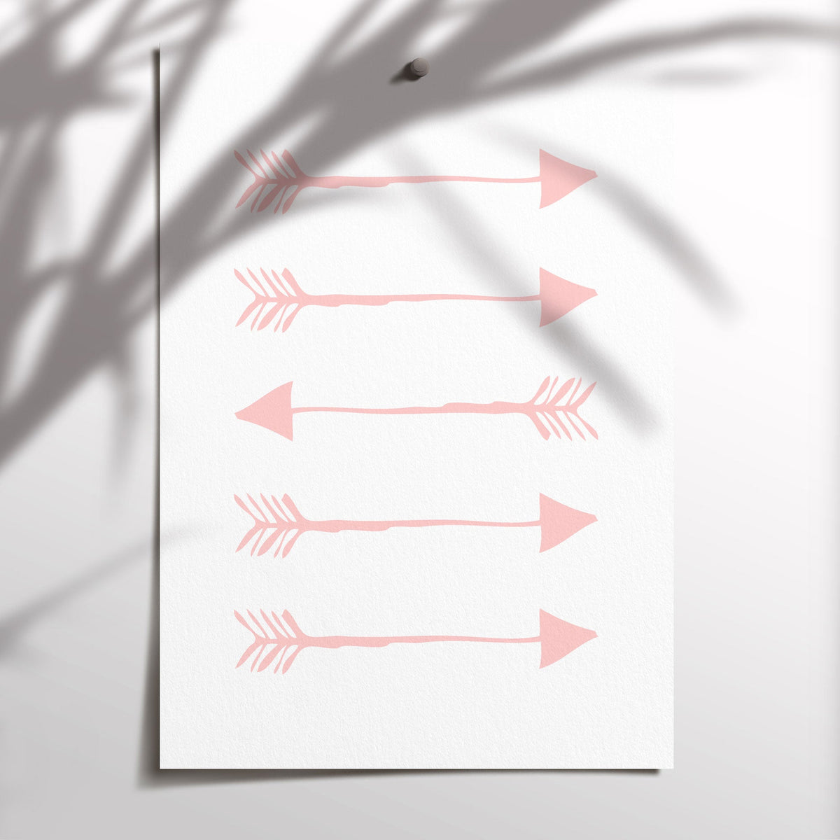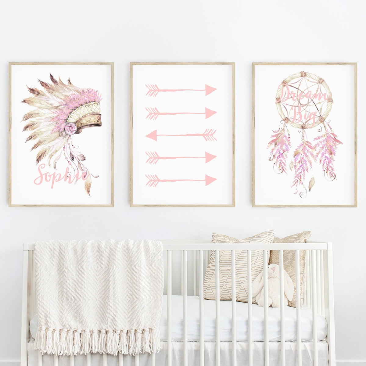 A set of three prints, featuring a pink boho feather headdress, personalised with your child's name, dreamcatcher and tribal arrows.