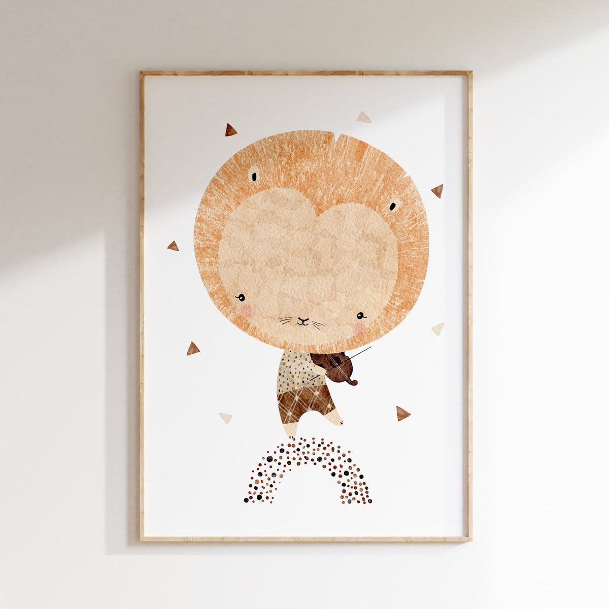 Unit price perThe perfect addition to the music or animal themed nursery, bedroom or playroom decor is this jungle jazz elephant wall art print. Featuring a safari Lion playing the violin, this print is sure to please any little music lover.