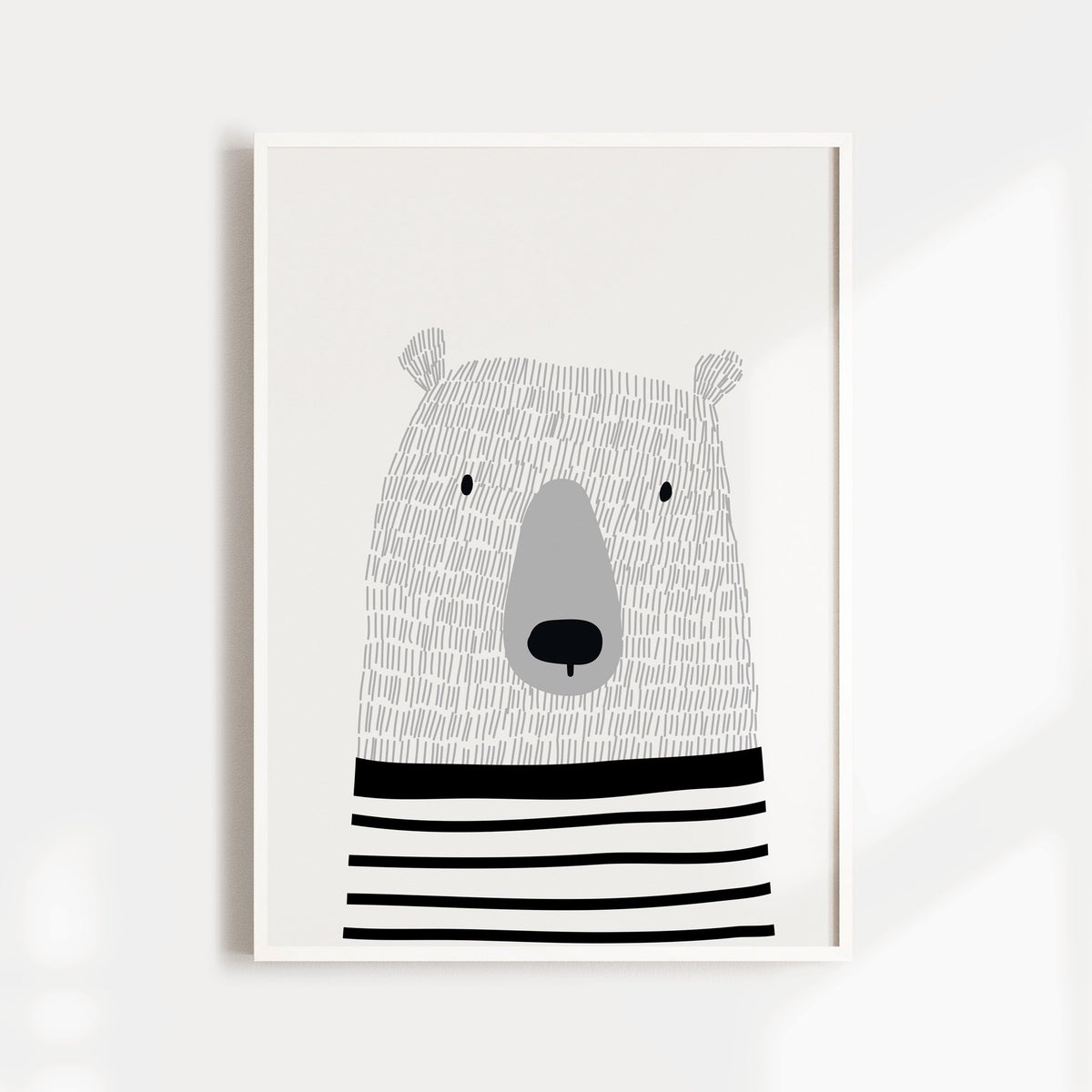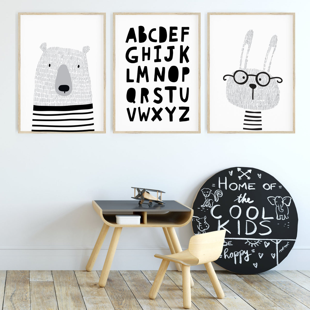 A set of three scandi, inspired bedroom wall art prints just for the boys. Featuring a bunny, bear and alphabet print.