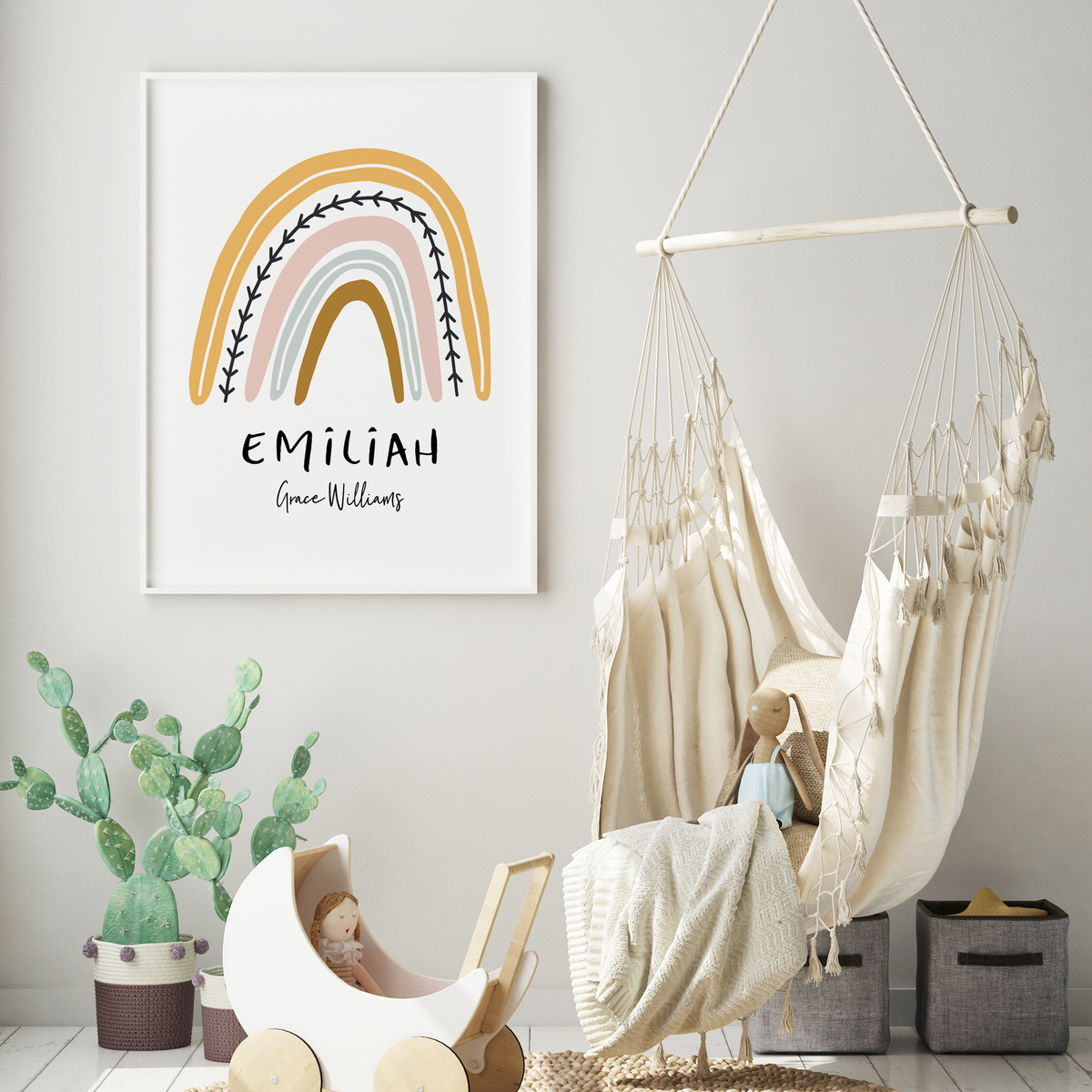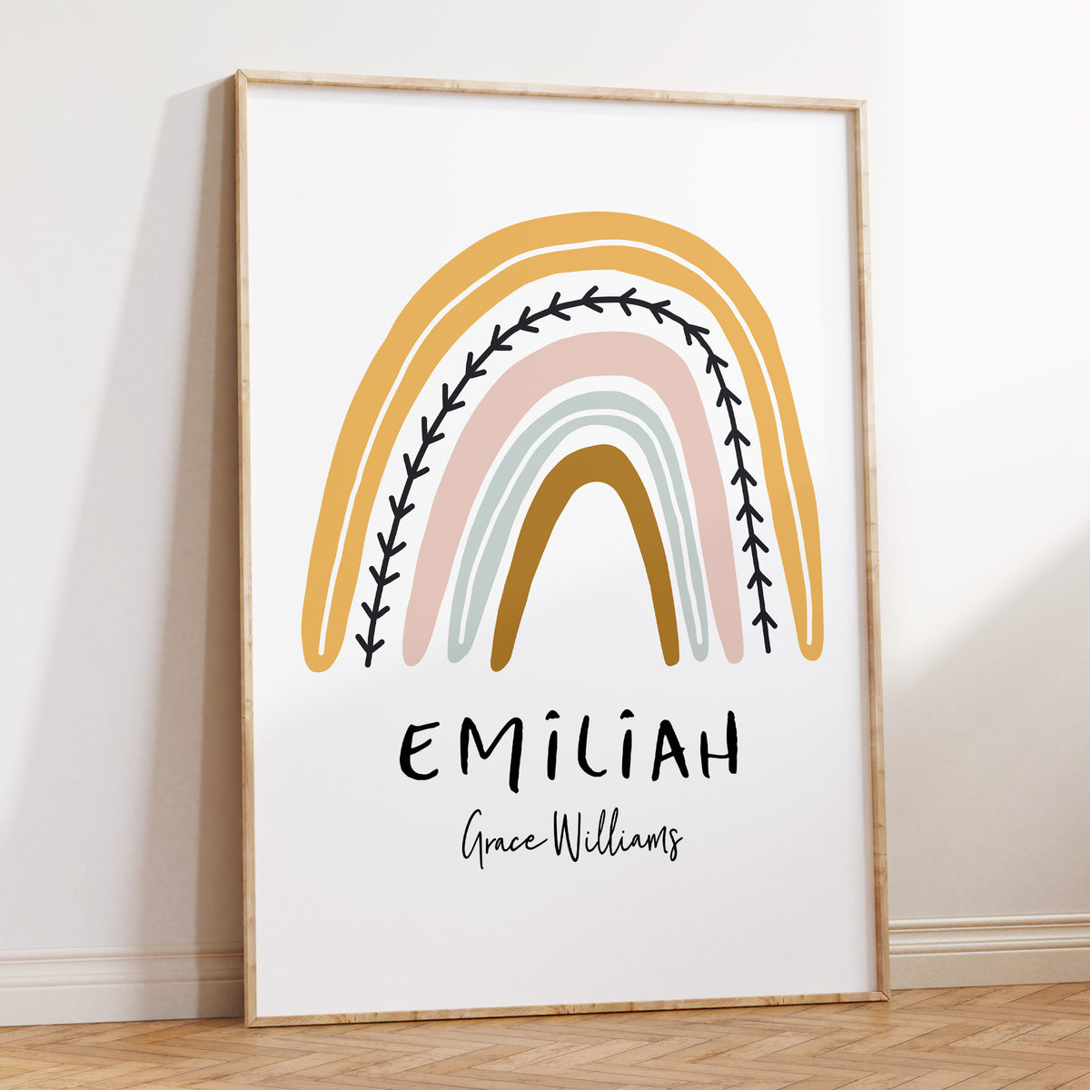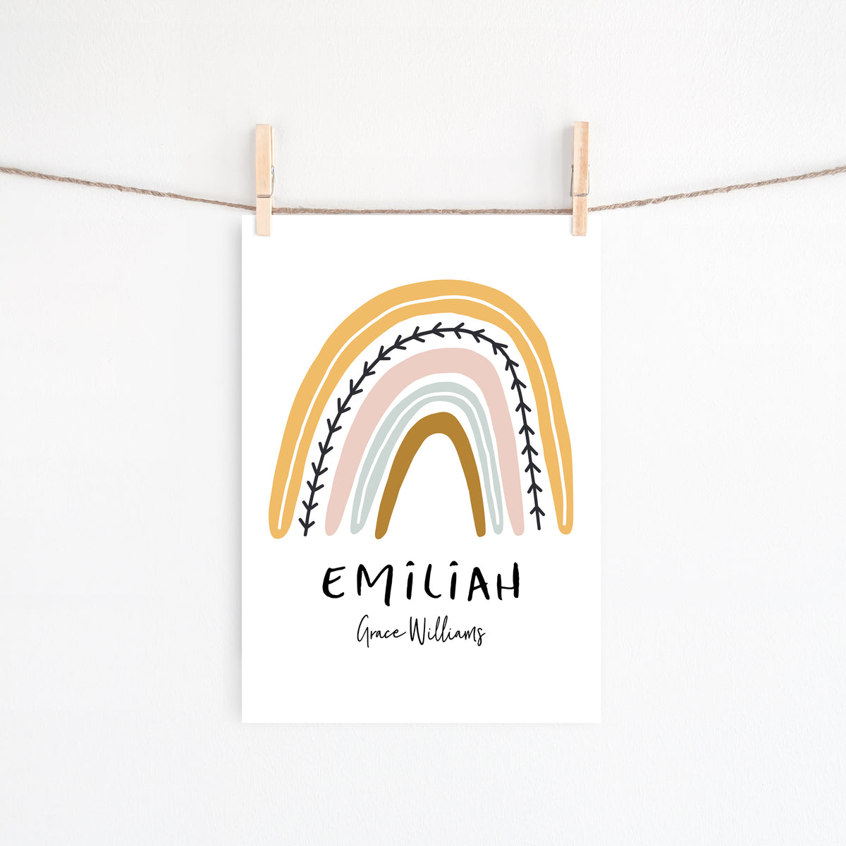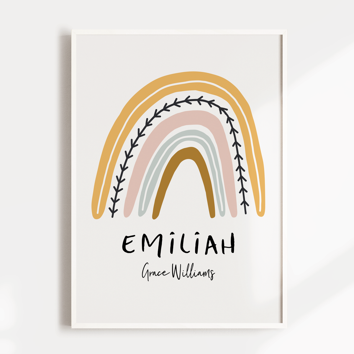 A muted boho rainbow wall art print, personalised with your child's name, or whatever details you would like included. A perfect new baby gift, or a great way to add the finishing touches to your own child's nursery or bedroom space.
