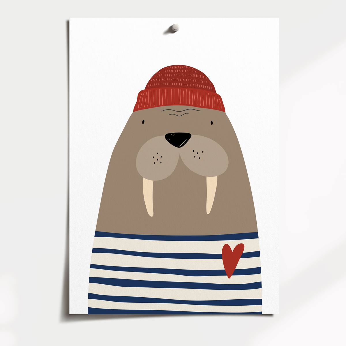 Unit price perA nautical inspired nursery wall art print featuring a sailor walrus. Use as a standalone piece or co-ordinate with our other matching art prints, perfect the oceanic themed nursery, bedroom or playroom.