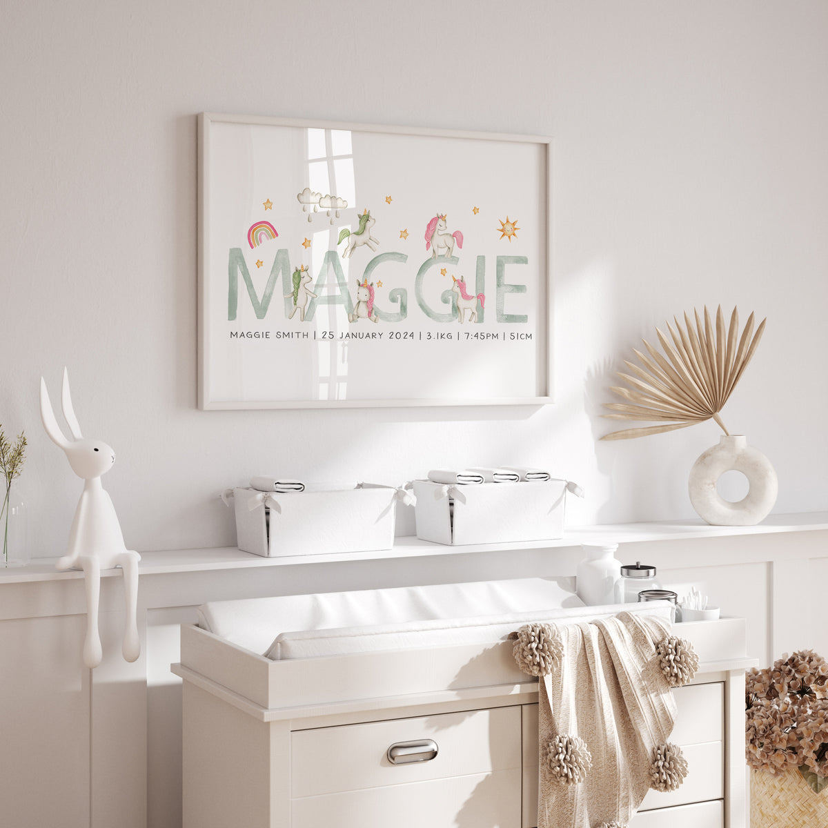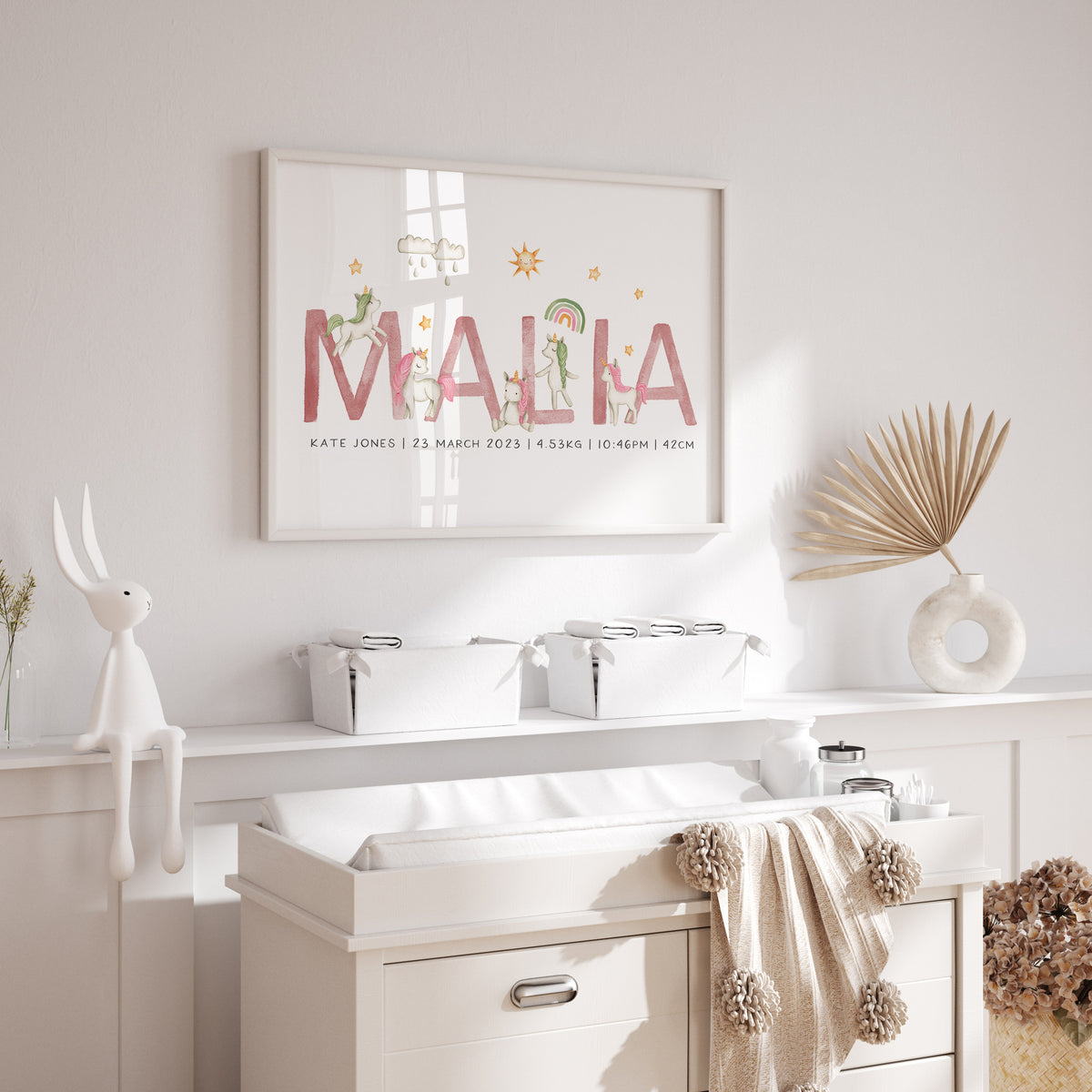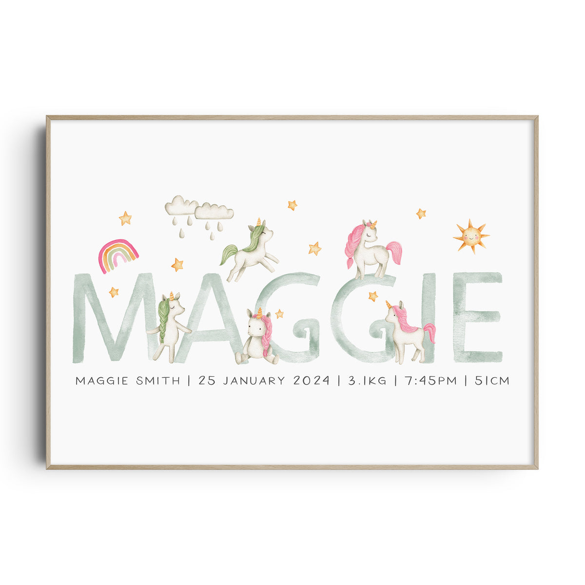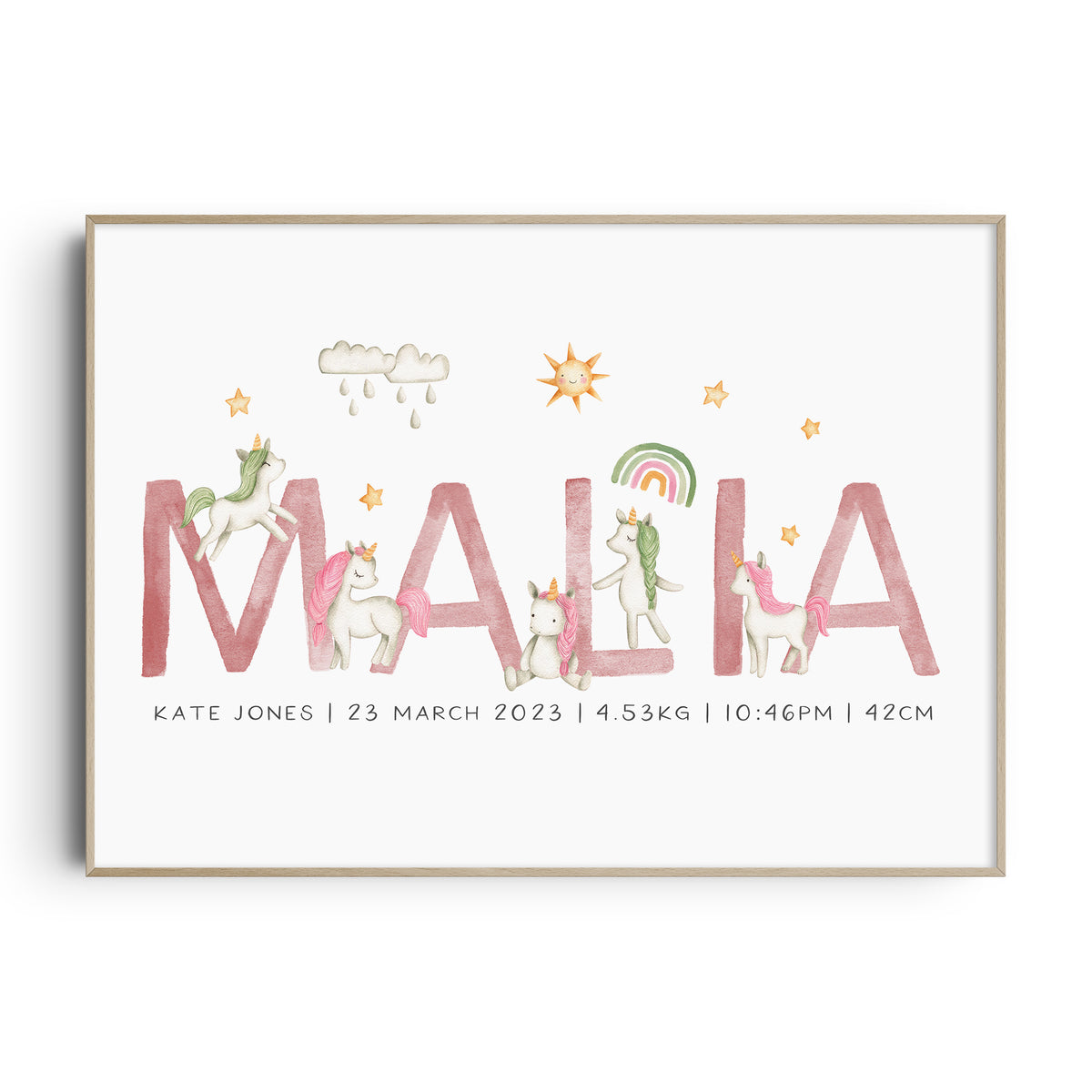Unit price perThis magical personalised unicorn name & birth details print is available in three different colour ways, along with the option to additional birth details or text. It will make a perfect new baby gift or simply add the finishing touches to your own little girl's nursery, bedroom or playroom decor