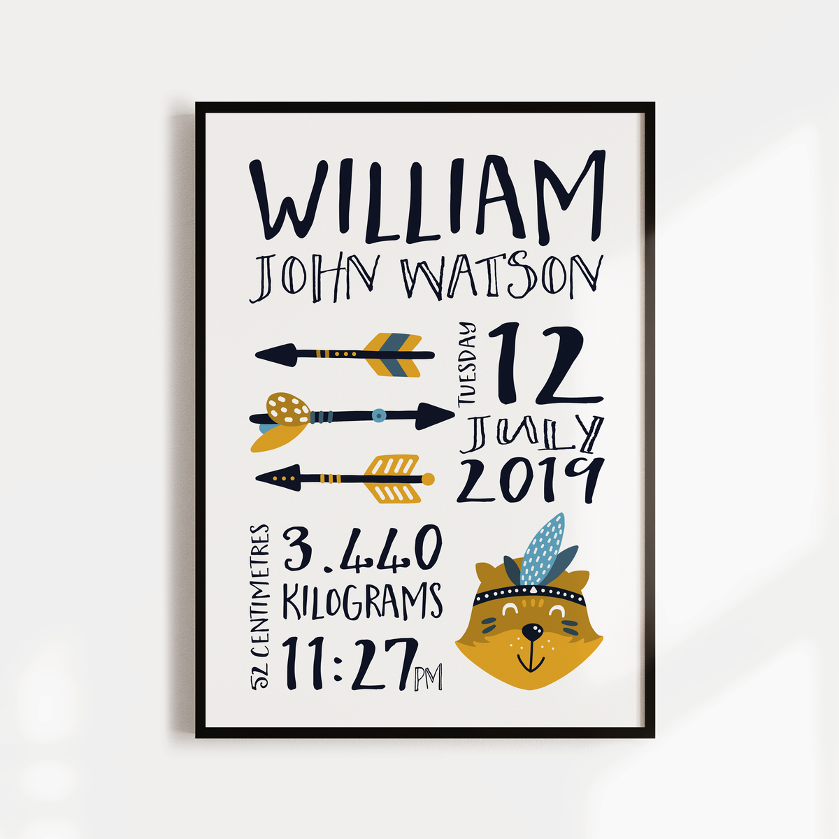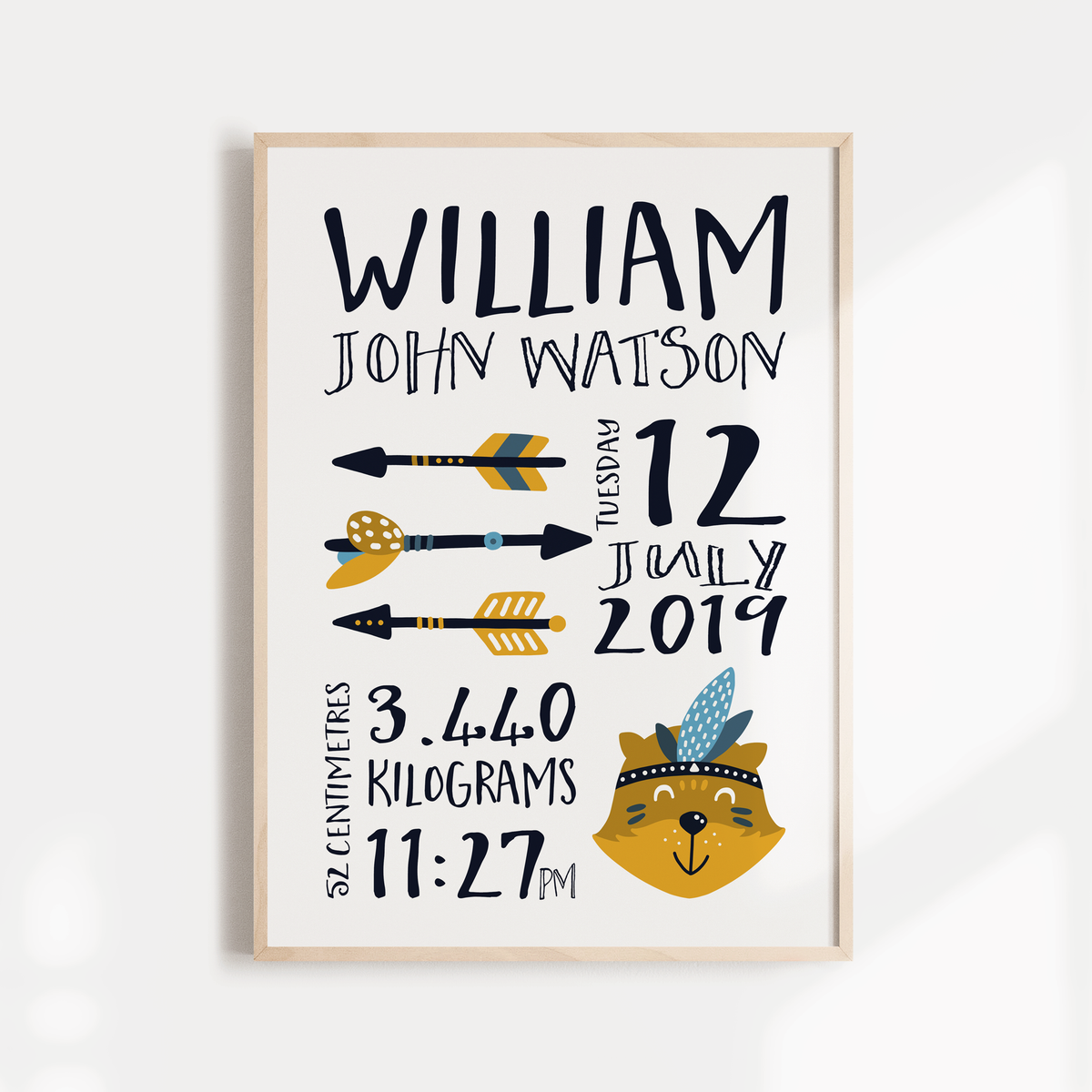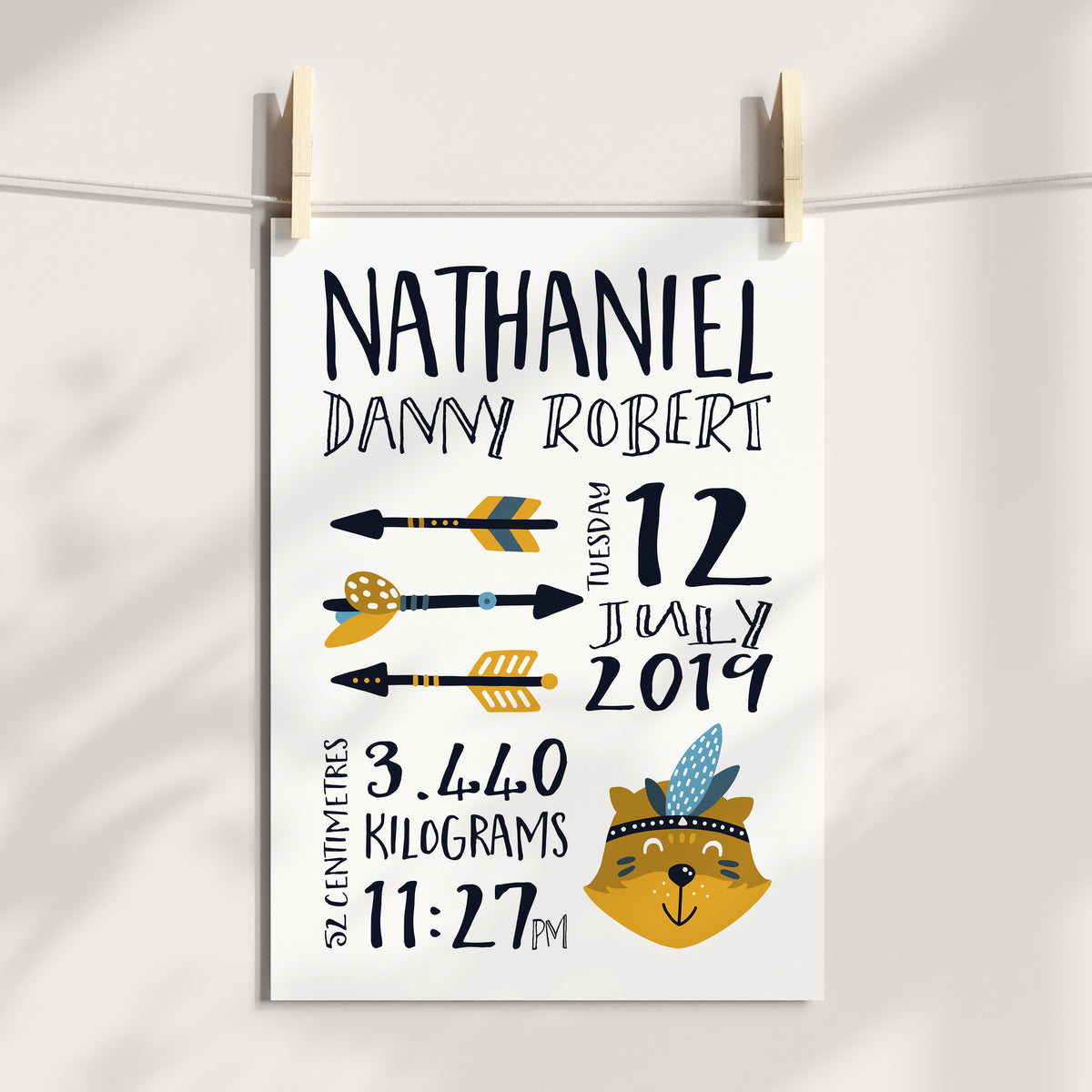 Unit price perA birth announcement nursery print, featuring a tribal bear and arrows, customised with your child's birth details.