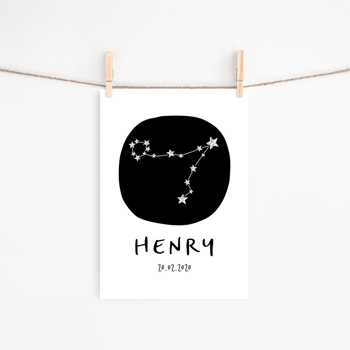 Unit price perA customised name and birth date wall art print, featuring the Pisces star sign constellation. A statement piece for the monochrome nursery or bedroom decor.