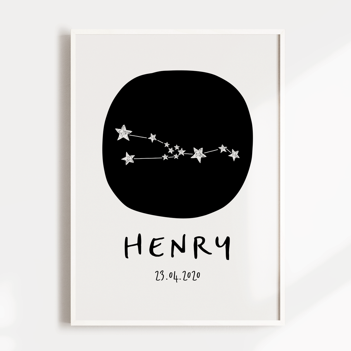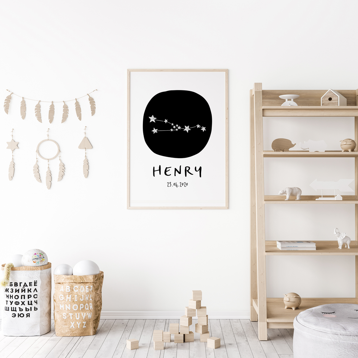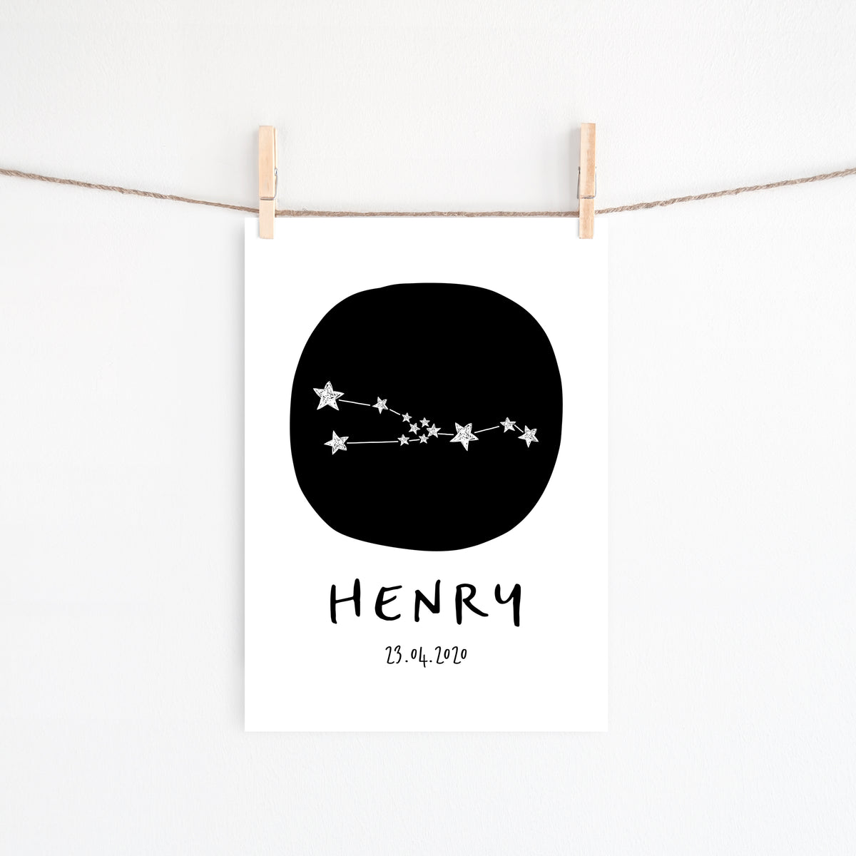 Unit price perA customised name and birth date wall art print, featuring the Taurus star sign constellation. A statement piece for the monochrome nursery or bedroom decor.